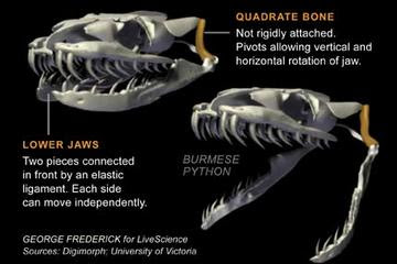They’re not really unhinging their jaws. Snakes just have a much more kinetic skull than we do—they have a greater number of movable joints. If you feel your lower jaw, it’s one solid bone. When you were much younger, though, you used to have a “joint” down the midline of your jaw (think of an invisible line extending straight down from below your two middle front teeth). This was never a movable joint, though since we don’t particularly need a joint there, and the two halves of your jaw fused together as you progressed in development, forming the mandibular symphysis.